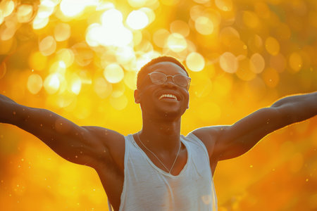 Young man with dark skin and curly hair laughing joyfully with eyes closed, showing bright white teeth and a wide, happy smile, basking in warm sunlight.