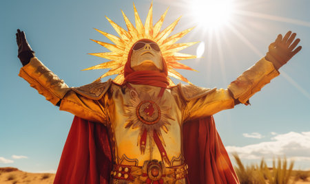 Young person in orange shirt beneath sunburst sky with divine rays through clouds. Spiritual meditation peace faith inspiration harmony nature. Heavenly atmosphere mindful enlightenment Ai generated