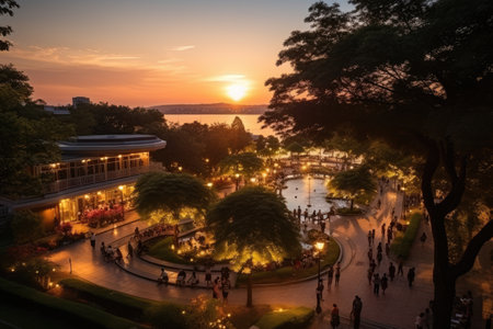 A bustling cityscape at sunset, with silhouettes of people walking along a waterfront promenade, modern skyscrapers reflecting the warm glow of the sun