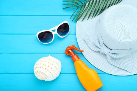 Summer straw hat with palm leaf, sunglasses, conch and moisturizing cream on blue wooden table