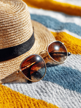 Summer vacation essentials including a straw hat and sunglasses on a colorful beach towel