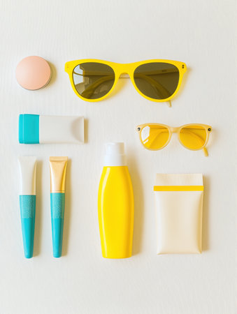 Sunglasses, sunscreen, and other summer accessories displayed on a white background, providing ideal products for sun protection and enjoyment.