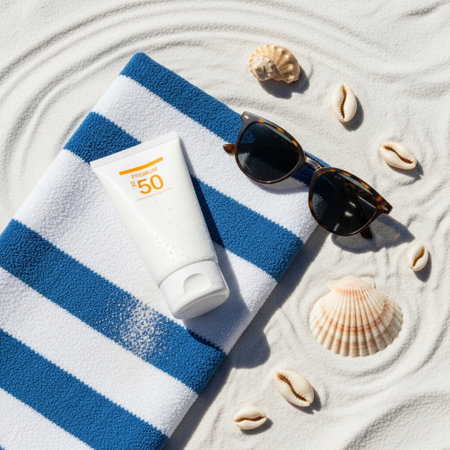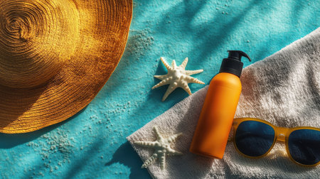 Sunscreen lotion, wide-brimmed hat, and sunglasses arranged on a sunlit beach, ideal for summer protection and vacation visuals.