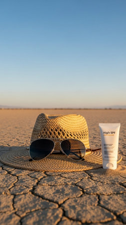 Sunscreen lotion with hat and sunglasses on the desert background.