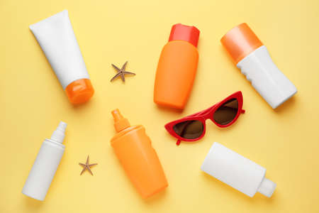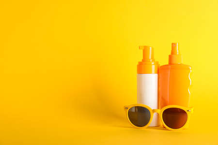 Different sun protection creams and sunglasses on color background