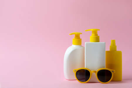 Sunscreen bottles and sunglasses on pink background