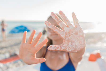 A young European teenage girl stretched her arms forward with sunscreen and sun protection on her palms against the backdrop of a sea beach.