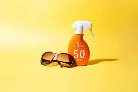 beach holidays. Sunblock bottle and sunglasses, seashell on yellow bright sunny background. top view. flat lay