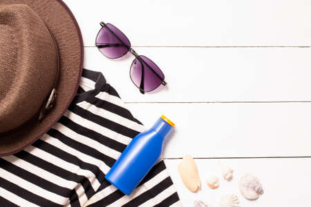 Top view. accessories clothes travel summer concept ,the beach with white black shirt sunglasses lotion cream vintage hat, jeans of bag and seashell on white wood table Copy space for your text.