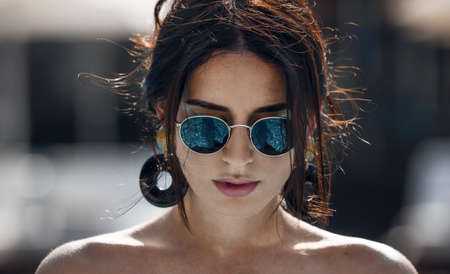 Asian female holding sunglasses in hands towards the sun and rays passing through it with lens flare