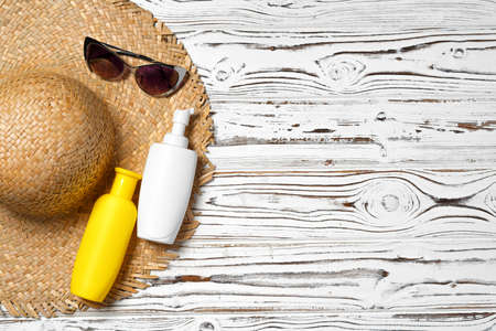 Skin care with sunscreen. Sun lotion and suglasses with straw hat