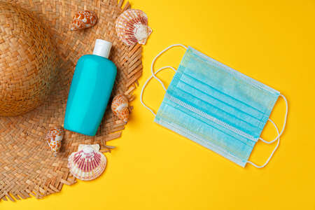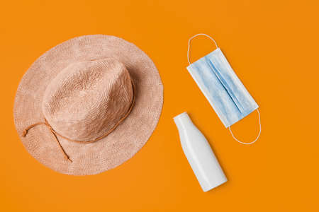 Sunscreen cream and protective mask. Coronavirus summer concept