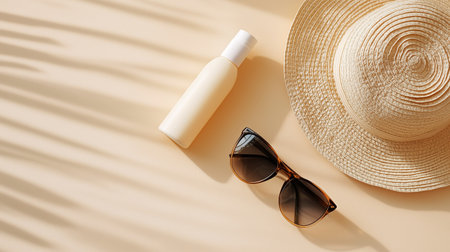 A summer beach essentials layout featuring sunglasses, sunscreen, and a straw hat on a warm surface