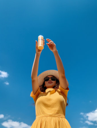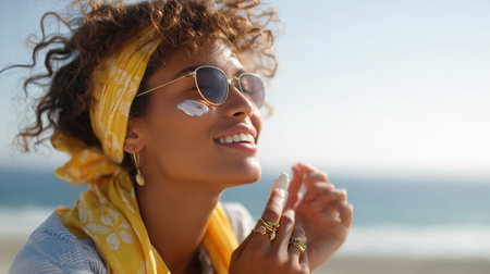 Woman applying sunscreen and enjoying the sunny beach atmosphere with vibrant accessories and a joyful expression