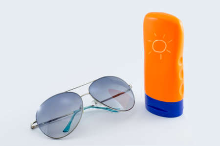 sunglasses and body lotion on white background