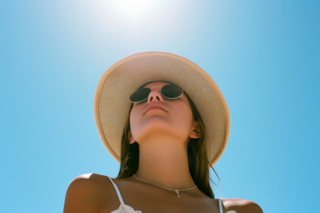 A woman in a summer outfit stands against a clear blue sky, enjoying the warmth of the sun while wearing a wide-brimmed hat and stylish sunglasses.