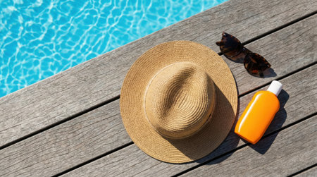 Top view of a straw hat, sunglasses, and a bottle of sunscreen lotion on a wooden deck next to the clear blue water of a swimming pool on a sunny day.