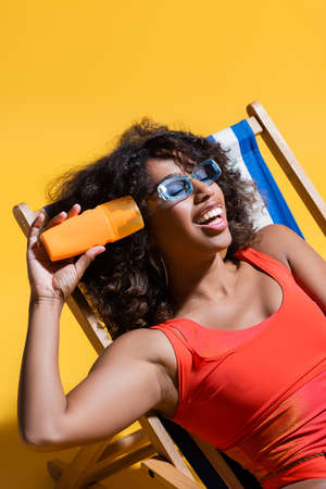 cheerful african american woman in trendy sunglasses sitting in deck chair with sunscreen on yellow background