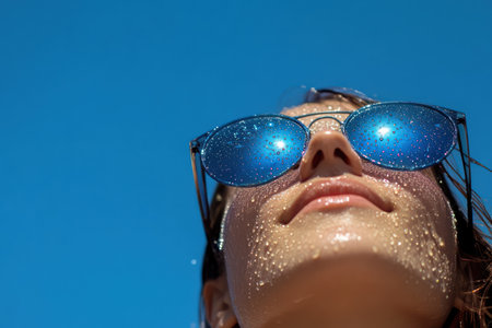 A woman with water droplets on her blue sunglasses gazes upward at the sky, enjoying a bright and refreshing sunny moment.