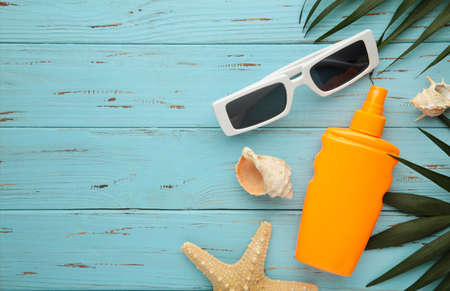 Red sunglasses, fragment of a straw hat, a bottle of sunscreen lotion, dried starfish and shells. Summer vacation and travel concept