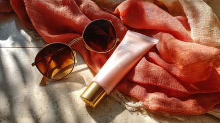 A beautifully arranged flat lay featuring stylish sunglasses, a beauty cream tube, and a soft scarf, all illuminated by gentle natural light, perfect for summer vibes.