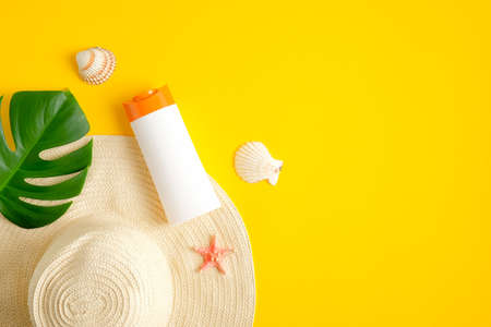 Sunscreen lotion bottle on yellow background with beach hat and tropical leaf. Top view with copy space. Sun protection cosmetic products, summer skin care concept