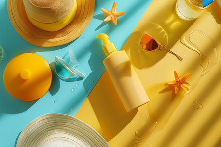 A suncream, shell and cap are on the yellow background. Sun protection products are on the yellow background.