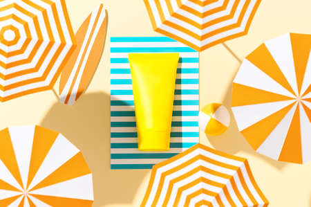 Sunscreen ad template, mockup. Concept of skincare during sunbathing under sunshine. Summer bright layout with tube of sunscreen and miniature beach accessories on colorful background. Top view