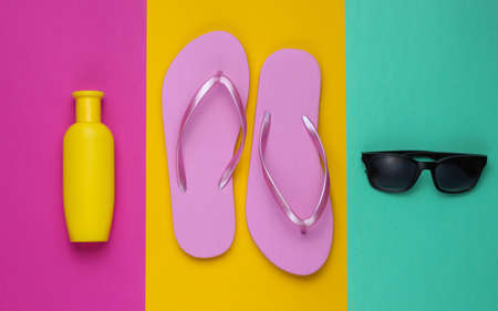 Beach accessories. Fashionable beach pink flip flops, sunblock bottle, sunglasses on colored paper background. Flat lay. Top view