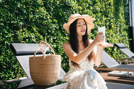 Beautiful asian woman traveler applying white lotion on body skin.