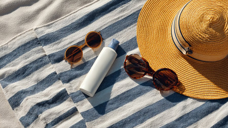 Beach hat, sun glasses and sunscreen lotion on a striped towel