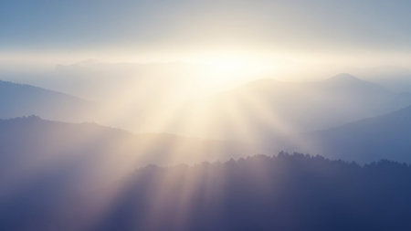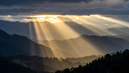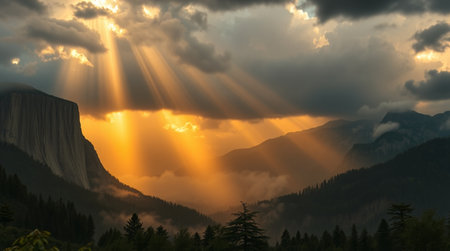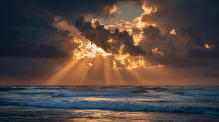Majestic rays of sunlight break through dark clouds, creating dramatic and serene atmosphere. interplay of light and shadow evokes sense of wonder and tranquility
