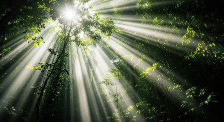 Sun rays pierce through the dense green canopy of a tropical rainforest, illuminating the misty air with dramatic light beams. A serene and natural forest scene.