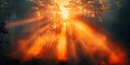 Sunbeams pierce through a misty forest illuminating the dawn. Concept Nature, Forest, Sunbeams, Misty, Dawn