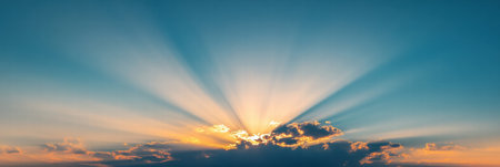 Sunbeams radiate from behind dark, textured clouds against a vibrant blue and orange sky.