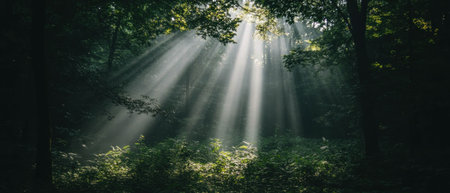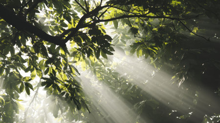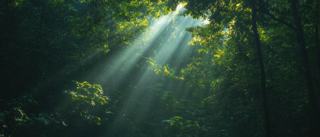 Magical sunbeams filter through the lush green foliage of a tranquil forest