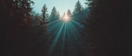 Ethereal sunlight filters through towering trees in a dense forest, creating radiant rays and a tranquil atmosphere, showcasing the beauty of nature and serenity.