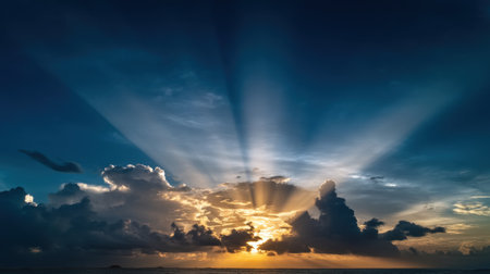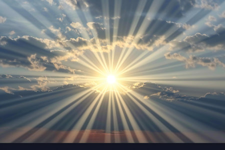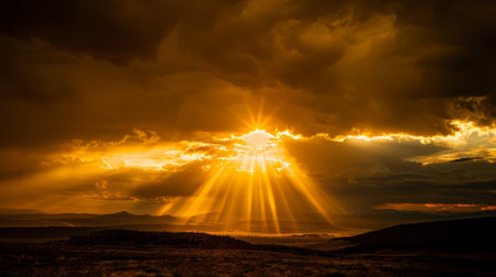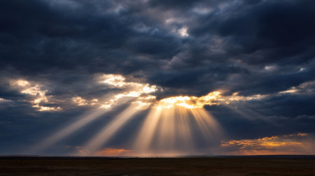 Stunning sunlight breaks through dark clouds, creating mesmerizing rays that illuminate the sky. A perfect representation of nature's beauty and tranquility.