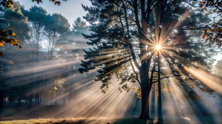 Golden sunbeams piercing through the misty forest at sunrise, creating an enchanting and serene atmosphere filled with beauty