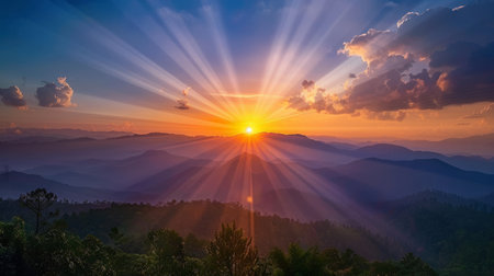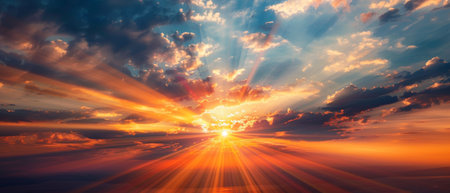 A breathtaking sunset captures the essence of nature's beauty, with vibrant colors and rays of light illuminating the scene over a tranquil ocean.