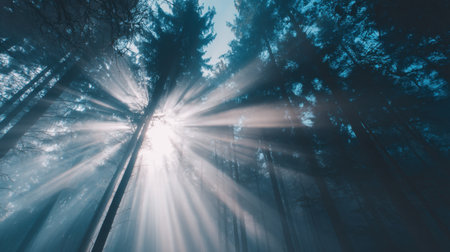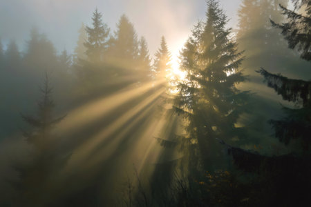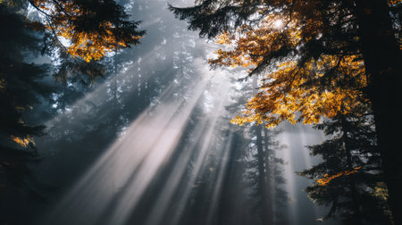 Explore a captivating scene of light rays filtering through towering trees in a foggy forest, evoking a serene atmosphere and inviting peaceful contemplation.