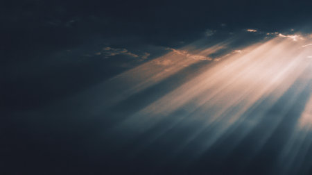 Embrace the serenity of nature with this image showcasing soft sunlight breaking through dark clouds, casting dramatic rays of light across the sky.