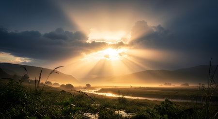 Golden sunbeams break through dark clouds, illuminating a misty valley with a winding river and rolling hills.