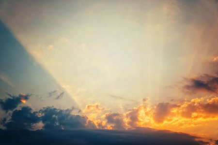Sunset sky with clouds and rays of light. Beautiful nature background