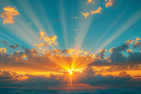Golden sunset against blue sky, bright sun rays pass through the clouds