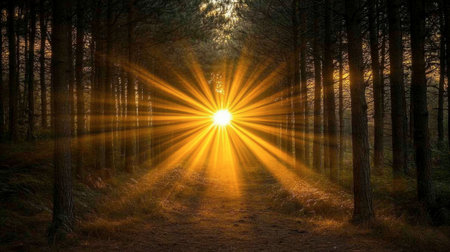 A stunning scene of sunlight bursting through trees in a tranquil forest. The golden rays create a magical atmosphere, illuminating the serene path ahead.