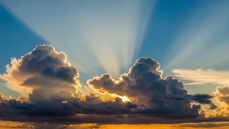 Majestic clouds illuminated by sunlight create stunning display in sky, showcasing rays of light breaking through dark formations. scene evokes sense of wonder and tranquility