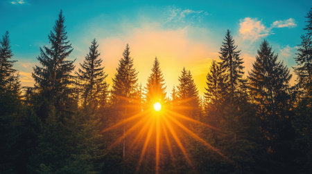Sunset or sunrise in the autumn coniferous forest. Nature background