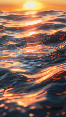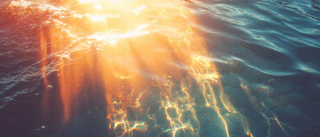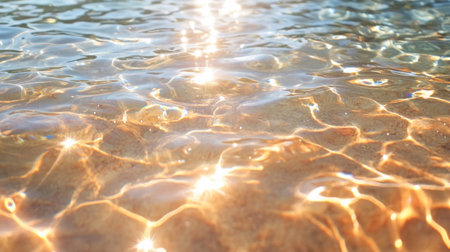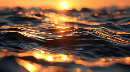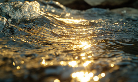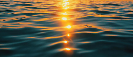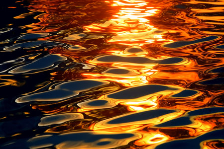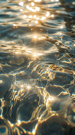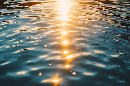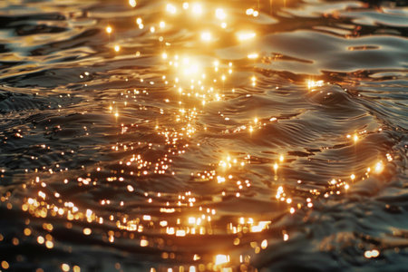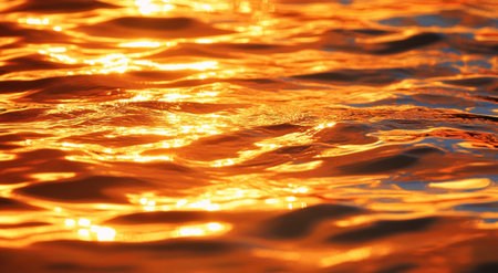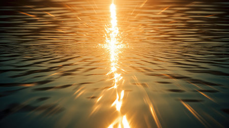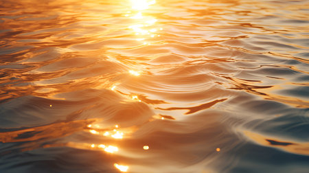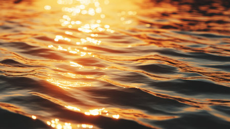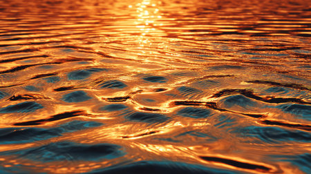 Shimmering surface of water reflects golden hues, creating mesmerizing pattern of light and movement. tranquil waves evoke sense of calm and beauty in nature