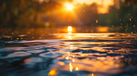 A mesmerizing view of a golden sunset reflecting off a calm water surface, creating a peaceful ambiance with bokeh light effects, symbolizing tranquility.